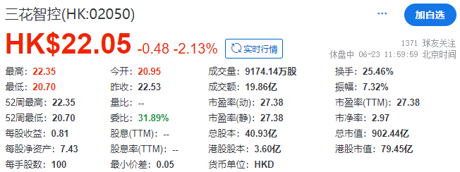 截至发稿时间,三花智控港股每股报22.05港元,总市值约902.44亿港元。