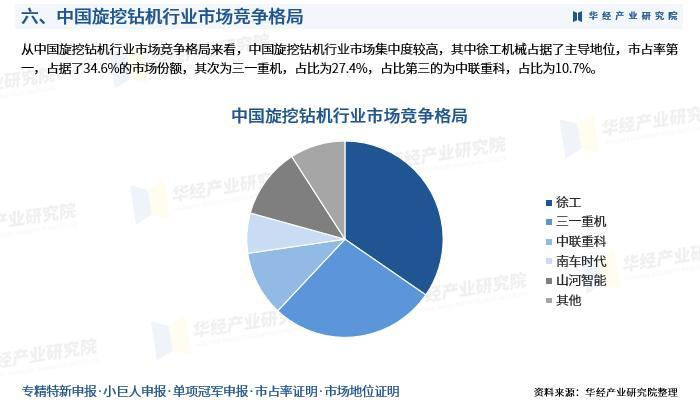 从中国旋挖钻机行业市场竞争格局来看,中国旋挖钻机行业市场集中度较高,其中徐工机械占据了主导地位,市占率第一,占据了34.6%的市场份额,其次为三一重机,占比为27.4%,占比第三的为中联重科,占比为10.7%。