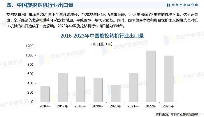 旋挖钻机出口市场自2021年下半年开始增长,至2022年达到近5年来顶峰,2023年出现了3年来的首次下降。这主要是由于全球经济的复杂形势和不确定性增加,导致国际市场需求疲软。同时,国际贸易摩擦和贸易保护主义的抬头也对桩工机械的出口造成了一定影响。2023年中国旋挖钻机行业出口量为994台。