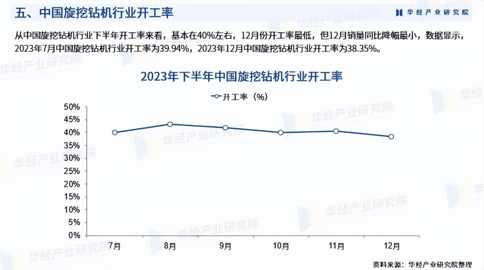 从中国旋挖钻机行业下半年开工率来看,基本在40%左右,12月份开工率最低,但12月销量同比降幅最小,数据显示,2023年7月中国旋挖钻机行业开工率为39.94%,2023年12月中国旋挖钻机行业开工率为38.35%。