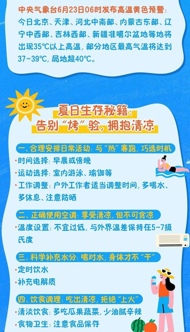图知道|热力全开!你的高温生存指南已送达,请注意查收! 中国青年报 《中国青年报》官方账号 2025.06.2314:55 关注 今日6时,中央气象台发布高温黄色预警,全国多地将现35℃以上高温,局地超40℃,“炙烤”模式上线。别慌!一起读图“解锁”人们如何在高温天气下做好防暑降温、科学运动的全攻略。 来源:中国青年报客户端