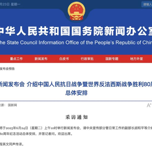 据国新网消息,国务院新闻办公室将于2025年6月24日(星期二)上午10时举行新闻发布会,请中央宣传部分管日常工作的副部长胡和平等介绍中国人民抗日战争暨世界反法西斯战争胜利80周年纪念活动总体安排,并答记者问。