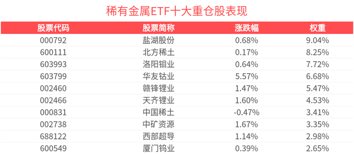 数据显示,截至2025年5月30日,中证稀有金属主题指数前十大权重股分别为盐湖股份、北方稀土、洛阳钼业、华友钴业、赣锋锂业、天齐锂业、中国稀土、西部超导、中矿资源、厦门钨业,前十大权重股合计占比54.9%。