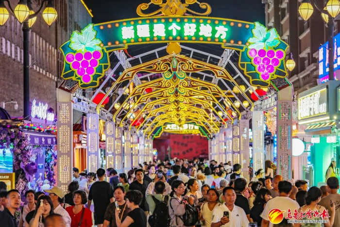 晚风裹挟着馕饼的麦香掠过街巷,夜幕下的大巴扎景区如同一簇点燃的千年丝路焰火,在夜色中绽放热情与璀璨。无论是新疆国际大巴扎的穹顶金辉,还是大巴扎步行街的琉璃灯影,抑或美食街蒸腾的烟火气,熙攘人潮与琳琅灯彩交织的每一幕,都在诉说这座城市的活力密码。