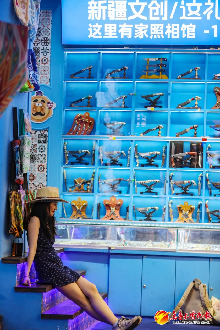 6月14日晚,在大巴扎景区,来自浙江的一名游客在一家文创店打卡拍照。