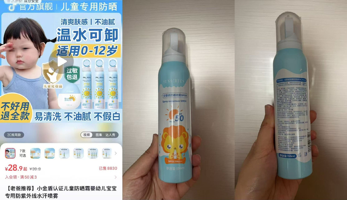 记者在某短视频平台以“儿童防晒霜”为关键词进行搜索,一款名为安歌依防晒喷雾的产品排名靠前,该店铺名称为“Algn爱兰歌娜运动包旗舰店”。产品介绍页面显示该产品“适用0-12岁”“儿童专用防晒”,产品介绍图还突出了小金盾。但记者在该店铺购买的实际产品外包装却并没有小金盾,亦未标注产品适用年龄。