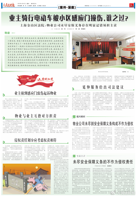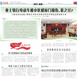 为进一步让当事人感受到司法的便捷与高效,让居民“零距离”感受司法公正,主动融入“共建共治共享”社会治理新格局,金山区法院采取巡回审判的方式,在案发社区开庭审理该案并当庭宣判。庭审结束后,主审法官在现场进行判后答疑,针对物业常见法律问题开展普法讲座,以案释法。法官还提醒业主,应当对自身安全尽到必要注意义务。感应门虽然能够“感应”,但也应当预留合理的时间通过,物业公司一般要求业主步行通过感应门,如业主骑行电动车通过,往往容易因车速过快、无法触发感应装置进而导致发生安全事故。“这是我第一次在现场观看法院审理案件,不仅感受到法律的威严,还学到很多法律知识,‘家门口的巡回审判’,来得值!”社区居民李先生表示。