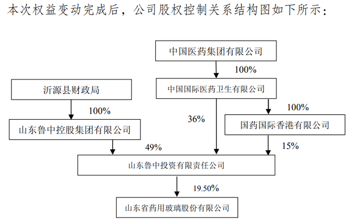 若本次权益变动顺利推进并实施完成,山东药玻间接控股股东将由鲁中控股变更为国药国际,实际控制人将由沂源县财政局变更为中国医药集团有限公司(下称“国药集团”)。