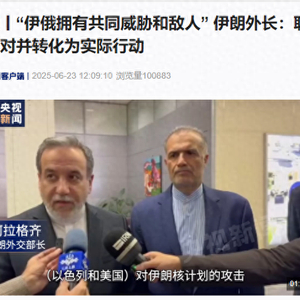 当地时间22日,伊朗外交部长阿拉格齐在莫斯科接受采访时表示,美国和以色列对伊朗核设施及其他关键目标的袭击公然违反《联合国宪章》。“(美国对伊朗进行的)是一次新的袭击,伊朗是对非法侵略行为的回应。”他强调,此类行径严重破坏国际秩序,其恶劣影响将波及整个地区乃至全球。