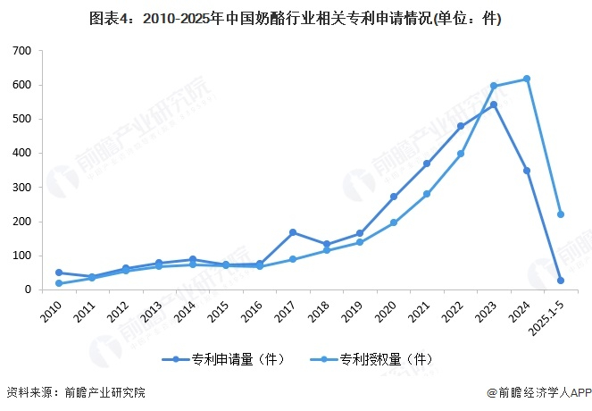 国家知识产权局数据显示,目前我国奶酪相关专利数量累计超过3700件。近年来,我国奶酪行业相关专利整体呈波动态势。2015年后波动较为明显,每年申请量整体在100件以上,2023年达到541件,专利授权量为597件。截止2025年5月27日,专利申请量为27件,授权221件。