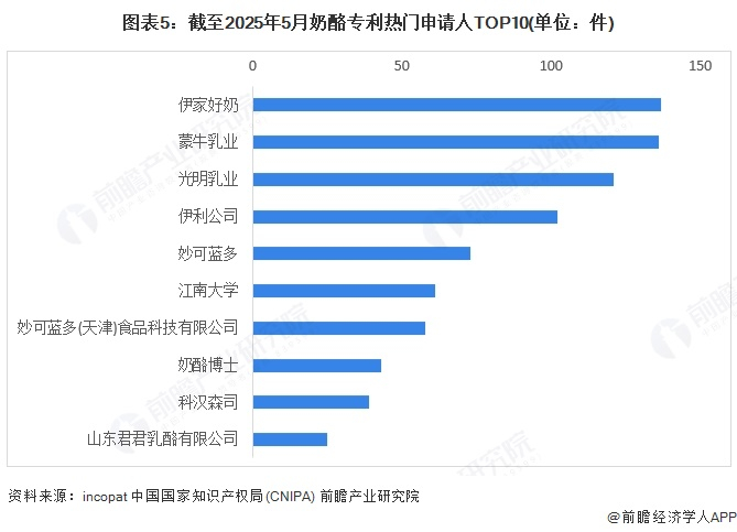 热门申请人是伊家好奶,是伊利集团的全资子公司,专注于奶酪产品研发、生产与销售。截至2025年5月,公司申请专利数量为137件,其次是蒙牛乳业、光明乳业、伊利公司、妙可蓝多。整体来看,专利申请人集中度较低。