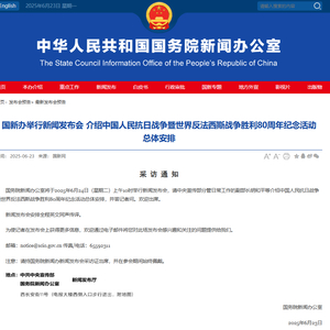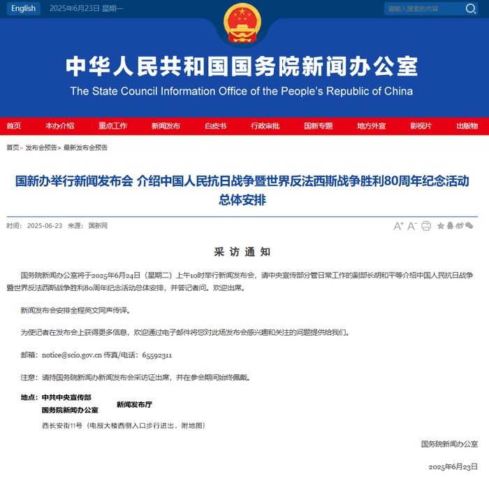 国务院新闻办公室将于2025年6月24日(星期二)上午10时举行新闻发布会,请中央宣传部分管日常工作的副部长胡和平等介绍中国人民抗日战争暨世界反法西斯战争胜利80周年纪念活动总体安排,并答记者问。