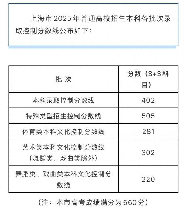 上海市2025年高考各批次录取控制分数线公布,本科控分线402分