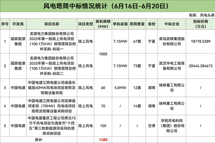 据风电头条统计,本周有5个陆上风电项目塔筒采购开标,规模为1280MW,开发商为国家能源集团、中国电建。