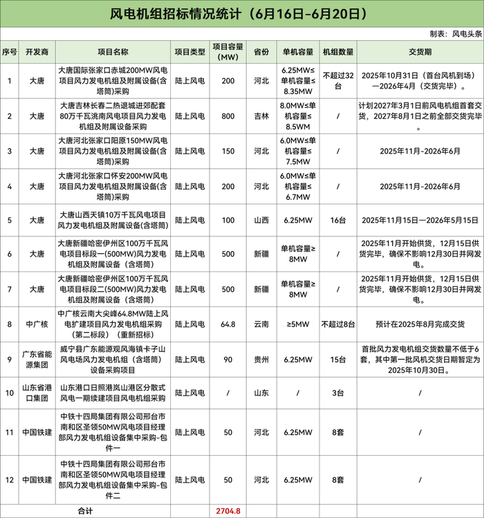 据风电头条统计,本周风机招标市场方面,共12个项目2704.8MW风机启动采购,开发商是大唐、中广核、广东省能源集团、山东省港口集团、中国铁建。
