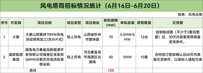 据风电头条统计,本周风电塔筒招标市场方面,共2个陆上风电项目120MW塔筒启动采购,开发商是大唐、国家能源集团。