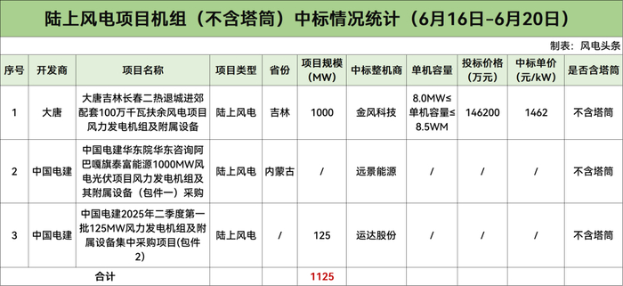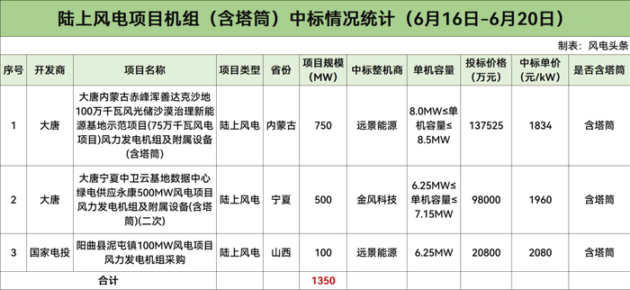 陆上含塔筒最低1834元/kW!本周2.48GW风机开标!【风电项目·周分析】
