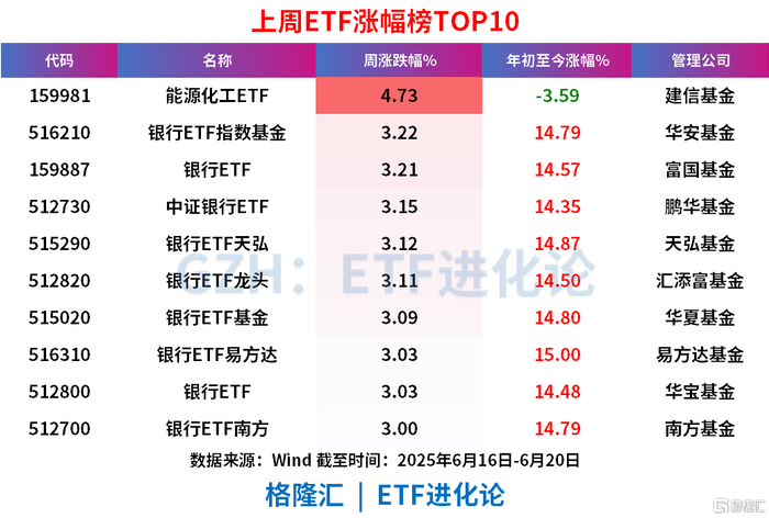ETF方面,建信基金能源化工ETF、华安基金银行ETF指数基金、富国基金银行ETF和鹏华基金中证银行ETF上周分别涨4.73%、3.22%、3.21%和3.15%。