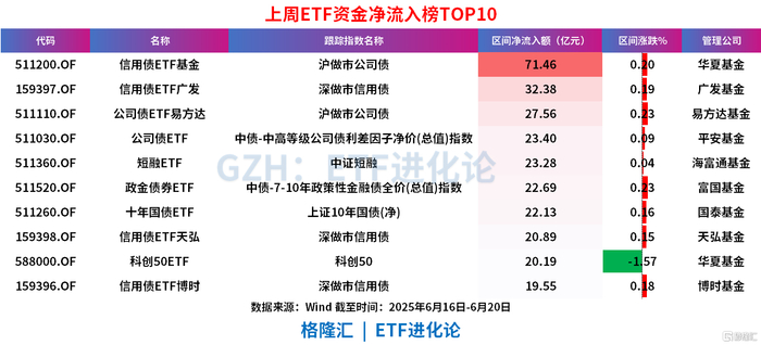 具体ETF产品来看,华夏基金信用债ETF基金、信用债ETF广发、公司债ETF易方达、公司债ETF、短融ETF上周合计净流入178亿元。