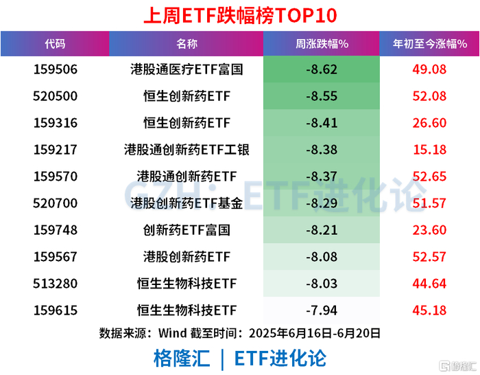 港股创新药主题ETF上周全线下挫,港股通医疗ETF富国、恒生创新药ETF、恒生创新药ETF、港股通创新药ETF工银、港股通创新药ETF和港股创新药ETF基金上周跌逾8%。