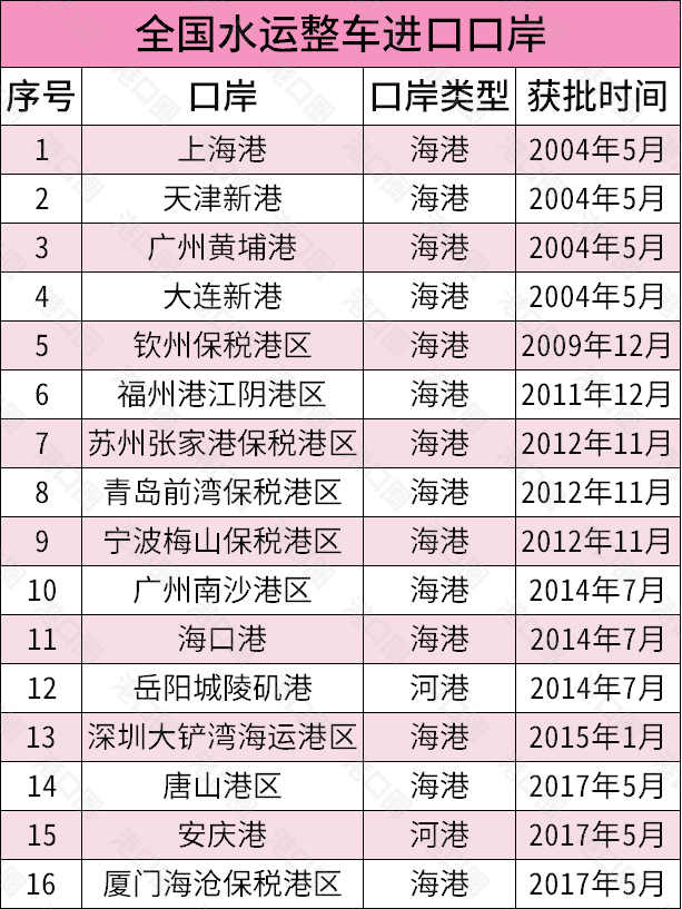 有滚装码头不代表就可以开展整车进口业务,2004年起实施的《汽车产业发展政策》指定了我国首批7个整车进口口岸,可开展从国外进口汽车整体业务,首批4个海港口岸即上海港、天津新港、广州黄埔港、大连新港。目前,全国有31个整车进口口岸,其中水运(海港、河港)口岸16个,基本上是一省一个口岸,分布在沿海、沿江省份。