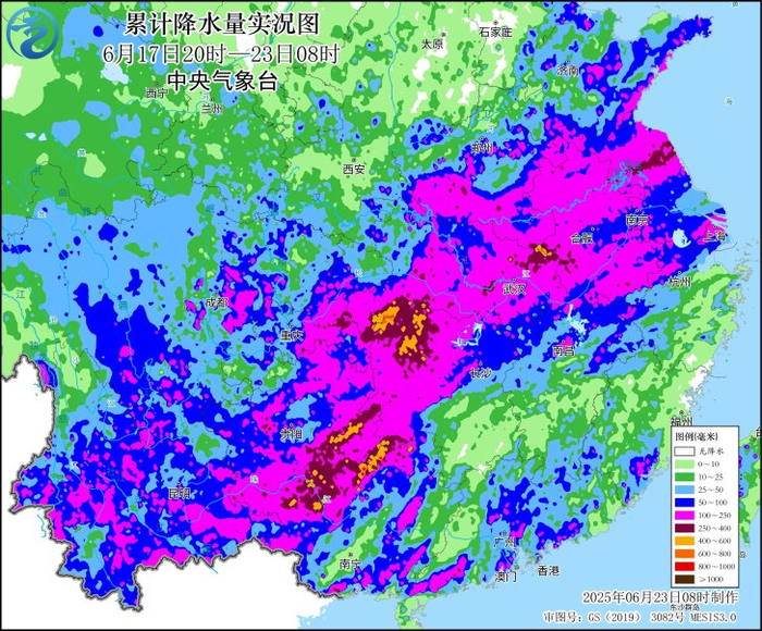 6月17日夜间以来,西南地区、江南西部和北部、江汉、江淮、黄淮南部等地出现大范围强降雨过程,强度为入汛以来最强。截至23日08时,广西北部、贵州东南部、湖南西北部、湖北西南部、安徽西部等局地累计降水量400~700毫米,广西柳州融水局地达1118.2毫米。