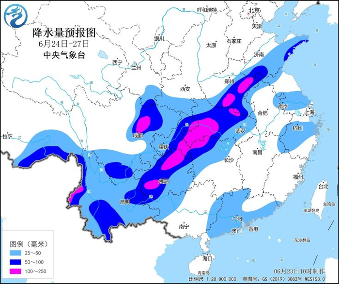 预计24日至27日,西南地区东部至江汉、黄淮等地将出现新一轮较强降雨过程。其中,四川盆地、重庆、贵州北部和西部、湖南西北部、湖北大部、河南中南部、山东中南部等地有大到暴雨,局地大暴雨;累计降水量60~150毫米,局地220毫米以上;并伴有短时强降水(最大小时降水量30~60毫米,局地可超过80毫米)、雷暴大风等强对流天气。