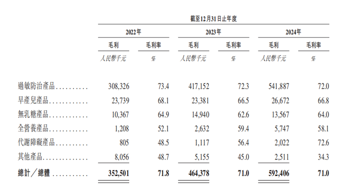 特配粉毛利率远高于其他奶粉。圣桐特医的主营业务过敏防治产品的毛利率在2024年为72%,整体毛利率为71%,较贝因美(002570)整体毛利率43%高出28个百分点。