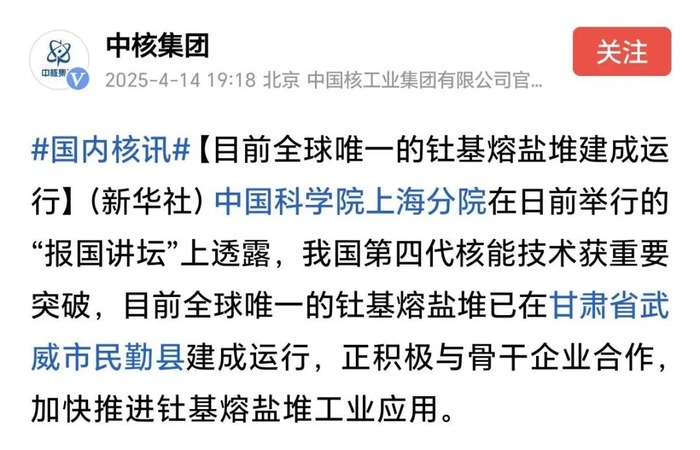 2025年4月,中国科学院上海分院发布消息,位于甘肃省武威市民勤县的热功率为2兆瓦的液态燃料钍基熔盐实验堆(代号:TMSR - LF1)已实现连续稳定运行,这是全球目前唯一运行中的钍基熔盐堆,是人类在第四代核电技术上迈出的关键一步。