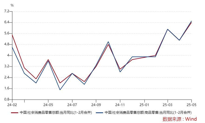 经济数据方面,5月社零同比增速为6.4%,超出市场预期,为2024年以来单月同比增速的最高水平。“以旧换新”政策涉及品类表现较好,据商务部最新数据显示,截至5月31日,2025年消费品“以旧换新”5大品类合计带动销售额1.1万亿元,发放直达消费者的补贴约1.75亿份。