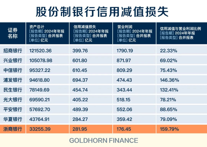 而哪怕只和上市股份行比较,浙商银行的信用损失也足够夸张。比如,华夏银行总资产比其多了超过1万亿,但两者信用减值损失相近;招商银行虽然信用减值损失比其多了100多亿,但要知道其总资产比浙商银行多了近9万亿。