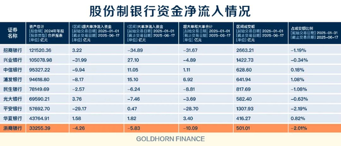 更值得警惕的是,今年以内,浙商银行在A股的超大单和大单净流入资金分别为-4.26亿元和-5.83亿元,这某程度反映出机构在二级市场对浙商银行的态度。此外,超大单和大单净流出合计超过10亿元,占同期成交额的比例,也在上市股份行中排名第二。