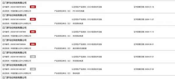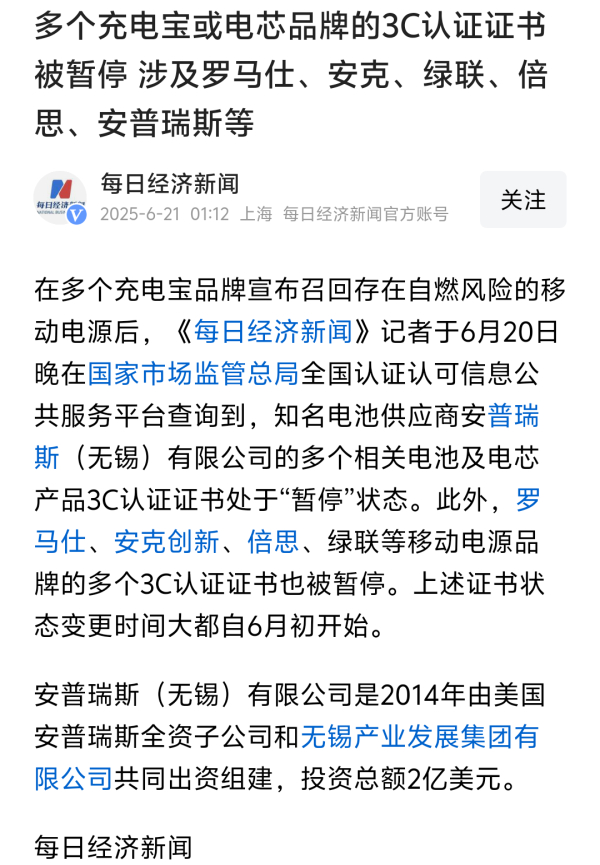6月20日,全国认证认可信息公共服务平台显示,罗马仕、安克创新、倍思科技以及绿联科技等公司多款移动电源产品的3C认证证书被暂停。行业上游企业,安普瑞斯(无锡)有限公司所有3C认证证书被暂停或撤销。