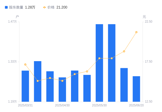 近一年(2024年6月20日至2025年6月20日),德固特A股股东户数从1.43万户,减低至1.28万户,降幅10.31%,区间股价上涨36.55%。