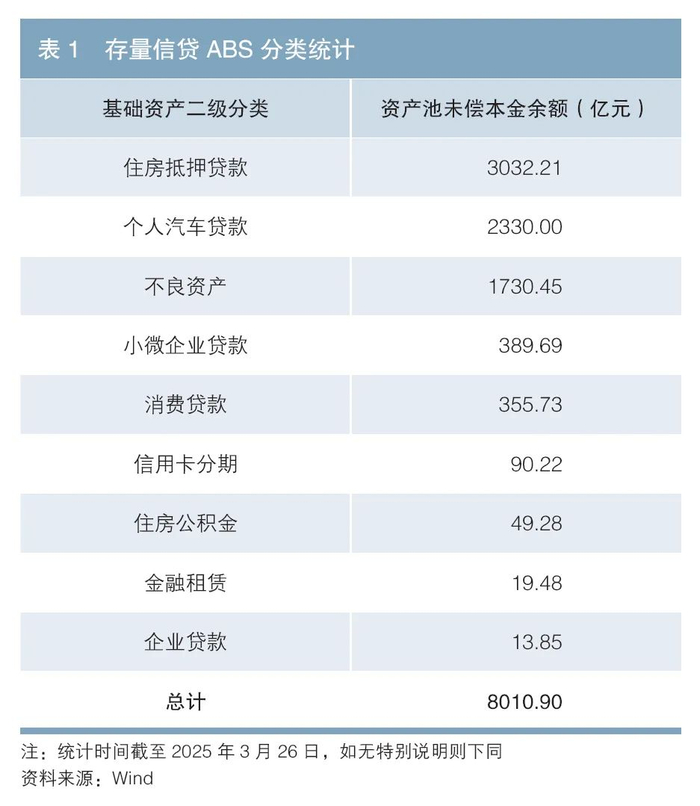 商业银行是信贷ABS的主要发行方,其主要发行目的包括盘活信贷资产(如住房抵押贷款、小微贷款、消费贷款、信用卡贷款等)、处置不良资产(NPL)、降低资本充足率等,以解决资产负债管理问题(谭海鸣,2022)。近年来,汽车金融公司逐渐发展成为活跃的发行机构,其目的在于拓宽融资渠道、优化负债期限结构(唐珊,2022)。依据万得(Wind)数据,按底层资产类型划分,笔者统计了当前信贷ABS市场的存量资产情况,结果如表1所示。