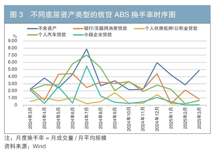 从成交活跃度来看,在2016年之前,企业贷款类信贷资产支持证券(CLO)的发行及存量占比最大,机构主要通过一级市场参与配置,二级市场交易不活跃。在2016年之后,随着房地产行业的飞速发展,住房抵押贷款资产支持证券(RMBS)发行规模逐渐反超,其久期和收益水平广泛适配商业银行、证券公司自营及资管等多类投资者的投资需求,信贷ABS二级市场的交易活跃度明显提升。然而,因2023年以来商业银行调整存量首套住房贷款利率间接导致部分RMBS早偿率上升,持有人面临预期外损失。此后,RMBS存量规模急剧缩减,计息方式转为浮息,信贷ABS市场的交易热点逐步向其他品种迁移(见图3)。其中,消费金融、NPL、汽车贷款等品种的流动性较好。但总体来看,受发行量下滑的影响,相较于2021年之前,信贷ABS总体成交活跃度呈降低趋势1。