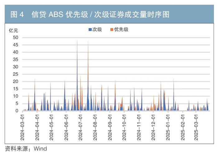 信贷ABS是结构化产品,当前,其次级产品交易量远高于优先级,而次级产品在整体规模中占比较低,这意味着次级产品的换手率较高(见图4)。和优先级相比,信贷ABS次级产品的信息披露透明度较低,肩负着吸收底层资产违约造成本金损失的责任,风险较高,结构相对复杂。因此,次级产品成交活跃度高于优先级这一现象较为特殊。