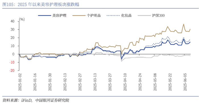 与此同时,国货美护产业持续升级,技术创新突破重塑市场格局。例如珀莱雅推出械字号医用胶原蛋白敷贴,丸美生物凭重组胶原蛋白技术领域创新获奖,国货品牌不断突破技术壁垒。国潮来袭助力美护与外资竞争,新时代悦己消费观念转换助力美护发展。美容护理板块2025年初至6月10涨幅为14.66%,领跑一级行业。受技术成分创新、营销热度、政策红利、消费情绪迎合等因素作用,国货美护仍具较高潜力。
