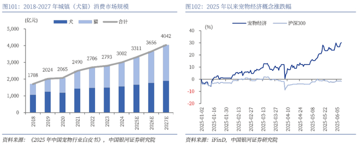 新消费赛道中,今年以来宠物经济概念持续升温。2024年城镇(犬猫)消费市场规模增长7.5%达到3002亿元,宠物数量较2023年增长2.1%。今年以来截至6月10日,宠物经济概念指数累计上涨30.13%。当前时代情感需求旺盛下,青年与老年群体对于宠物饲养的欲望变高,为宠物经济发展提供源源不断的基础动能。同时,宠物主对于宠物生活品质、情感需求要求变高,倒逼产业多元化创新升级,打开新的需求空间。政策协同端,多地政府通过制定专项政策,推动宠物产业链协同发展。
