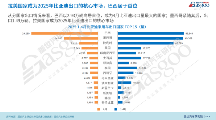 从出口目标市场来看,今年,拉美地区成为比亚迪出口的核心区域之一。4月,巴西以2.93万辆的出口量成为比亚迪出口的第一大市场,预计这一态势将在5月延续;墨西哥以1.49万辆的出口量成为第二大市场。