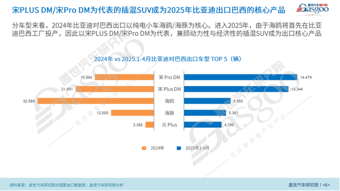在出口巴西的车型结构上,2024年,以海鸥、海豚为代表的纯电小型车是比亚迪对巴西出口的主力车型。其中,海鸥出口量达3.3万辆,海豚出口量为1.2万辆。