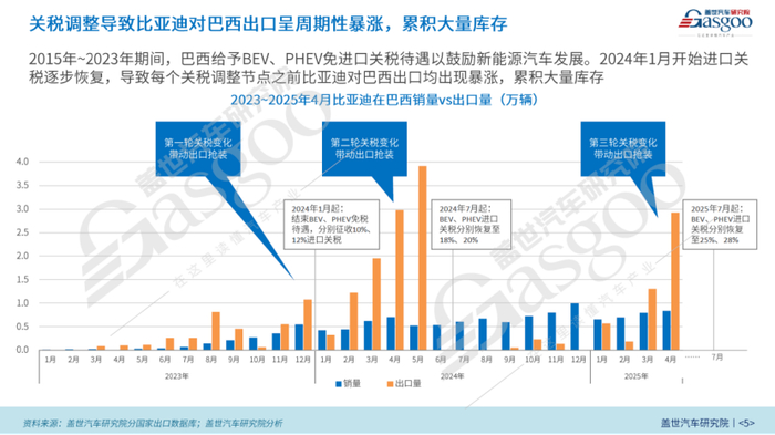 值得关注的是,巴西关税政策的动态调整,对比亚迪对巴西的出口产生了显著影响,导致出口量呈现周期性大幅波动,并形成了一定库存积累。