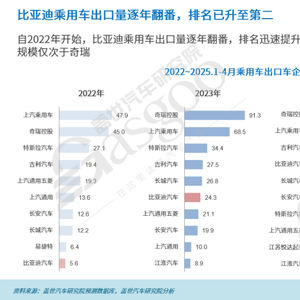 面对日益激烈的新能源汽车竞争,中国车企加速出海,其中比亚迪的出口增势最为迅猛。其乘用车出口量在短短三年间(2022-2025)实现了数倍增长,推动其出口排名从第十位急速跃升至行业第二,成为中国车企全球化的中坚力量。