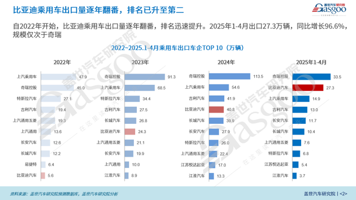 2025年1-4月:出口量已达27.3万辆,同比暴增96.6%,排名跃居第二位。
