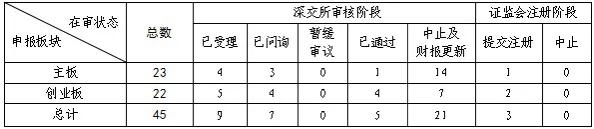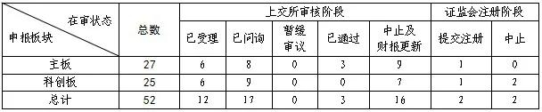 截至6月22日,各板块在审企业共208家。其中上交所52家(主板27家,科创板25家),深交所45家(主板23家,创业板22家),北交所111家。