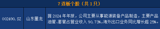 2、换手连板高度(剔除ST股)为7板,山东墨龙:油气装备+页岩气。