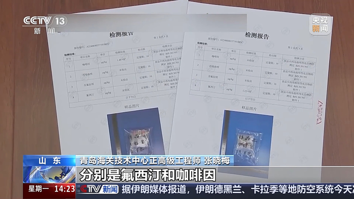 青岛海关技术中心正高级工程师 张晓梅:经检测,这7批“三无”减肥产品当中,有6个批次检出了非法添加药物,分别是氟西汀和咖啡因,属于高浓度的药物添加。