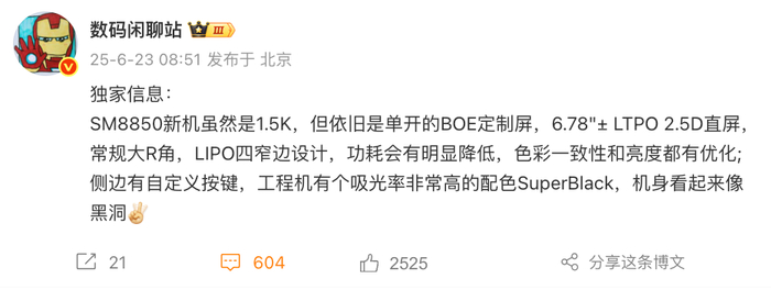 而值得注意的是,一加最近几代数字系列旗舰基本都是2K屏,所以一加14曝出是1.5K屏后也引发吐槽,现据爆料达人数码闲聊站暗示:“虽然是1.5K,但依旧是单开的BOE定制屏,6.78"± LTPO 2.5D直屏,常规大R角,LIPO四窄边设计,功耗会有明显降低,色彩一致性和亮度都有优化”,另外这次侧边会提供自定义按键,工程机有个吸光率非常高的配色SuperBlack,机身看起来像黑洞,大家或许可以持续关注下~