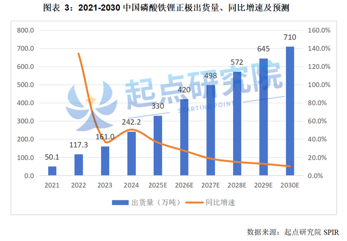 起点研究院SPIR预计2025年中国磷酸铁锂正极出货量将达330万吨,同比增长36.3%;预计到2030年中国磷酸铁锂正极出货量有望达710万吨,未来6年年均复合增速达19.6%。