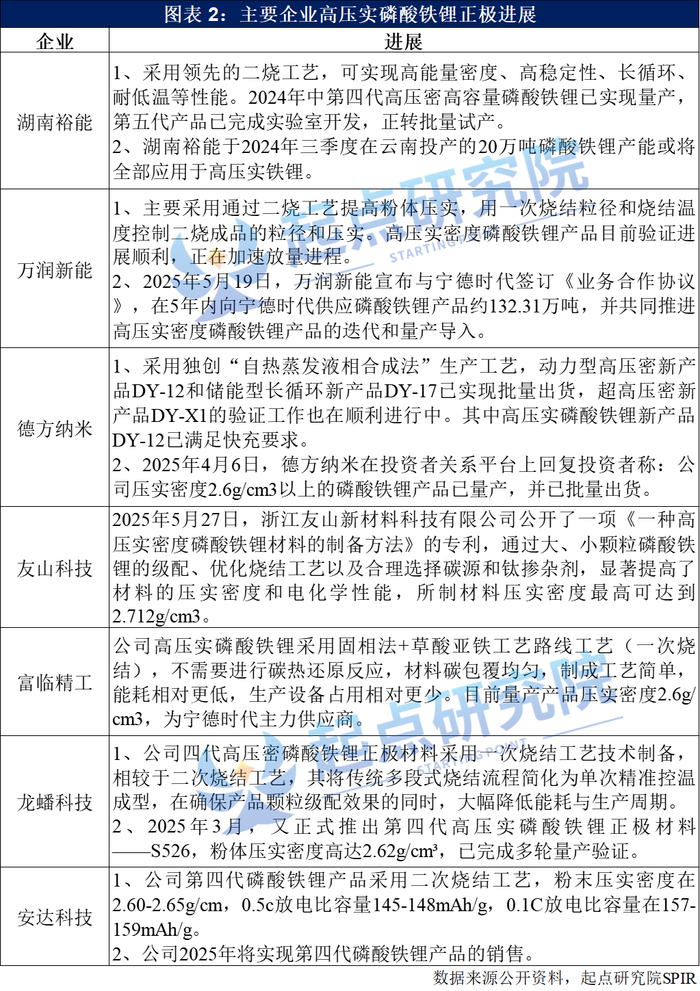 为提高锂电池能量密度、快充性能、安全性能等,磷酸铁锂正极往高压实方向迭代升级路线明确。目前磷酸铁锂已经发展至第四代产品。首代产品粉末压实密度维持在约2.30g/cm³,极片压实密度达到2.45g/cm³;二代产品粉末压实密度提升至2.40g/cm³,极片压实密度提升至2.55g/cm³;三代产品两项指标继续提升,粉末压实密度达到约2.50g/cm³,极片压实密度约2.65g/cm³左右。四代产品,当前市场公认的主流高压实磷酸铁锂,粉末压实密度进一步增至约2.60g/cm³,同时极片压实密度也达到2.75g/cm³左右。